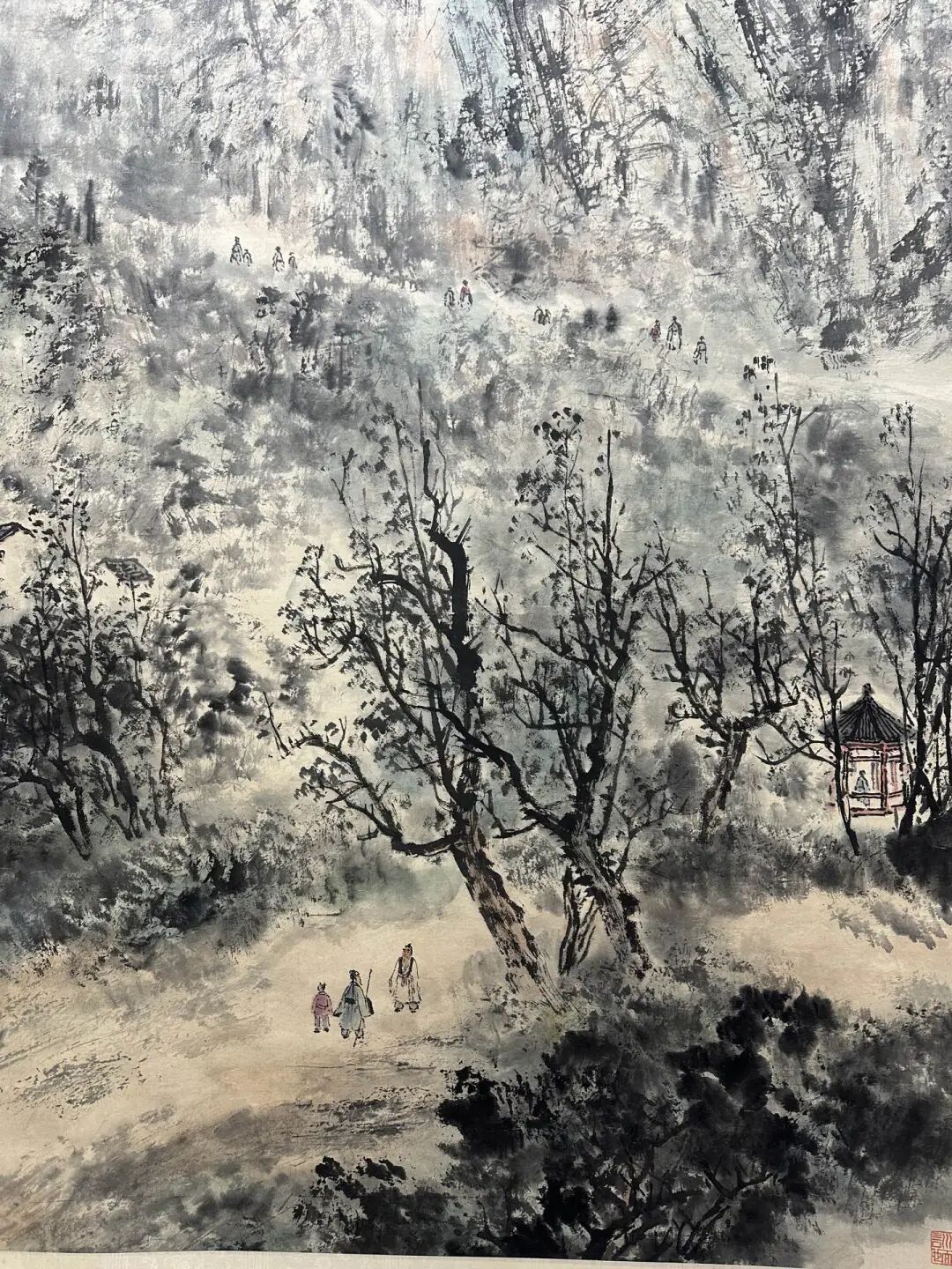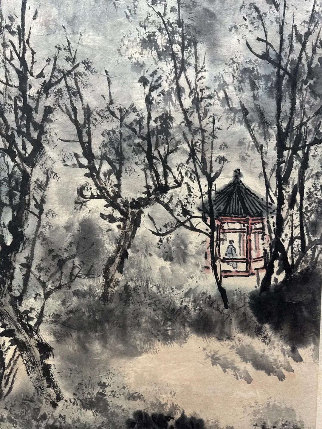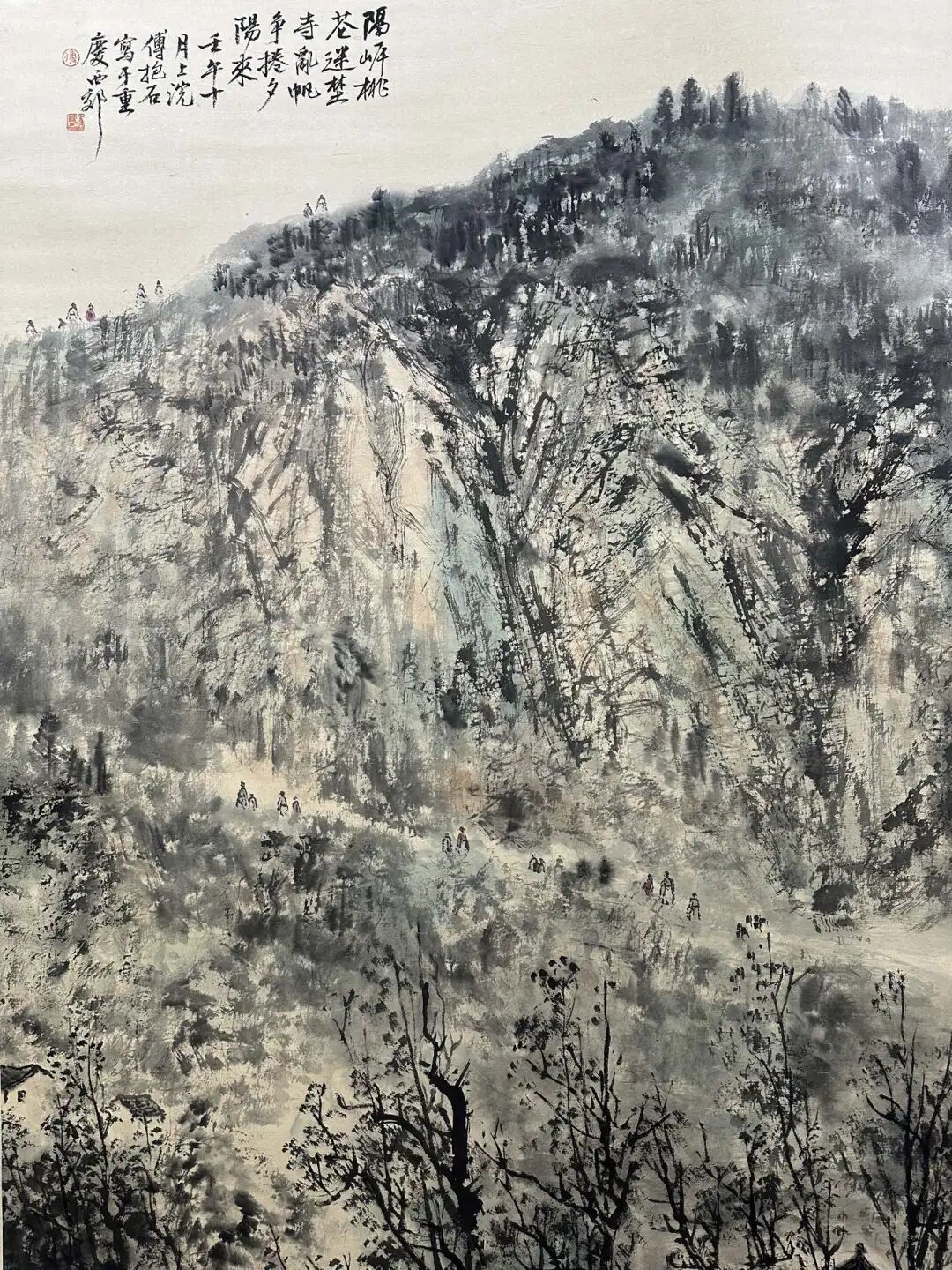 而且啊,傅抱石画这画的时候,说不定还喝着小酒呢。他作画喜欢“往往醉后”,酒一喝,灵感就来了,笔下的画也就更有神韵了。这《隅峁桃苍迷楚寺》,说不定就是他酒后一挥而就的佳作呢!