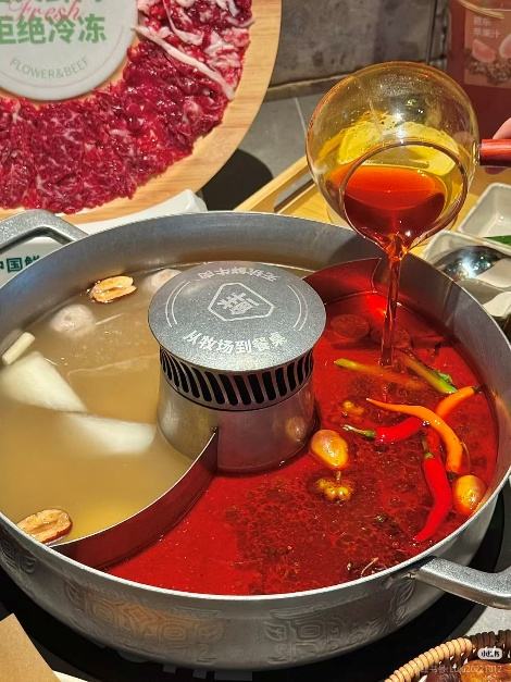 “锅底搭配使用来自自家屠场熬制的鲜牛油,搭配新鲜空运的香辛料。”左庭右院五角场万达店店长张整齐说,“相比同类产品,味道中少了厚重、多了鲜香。”